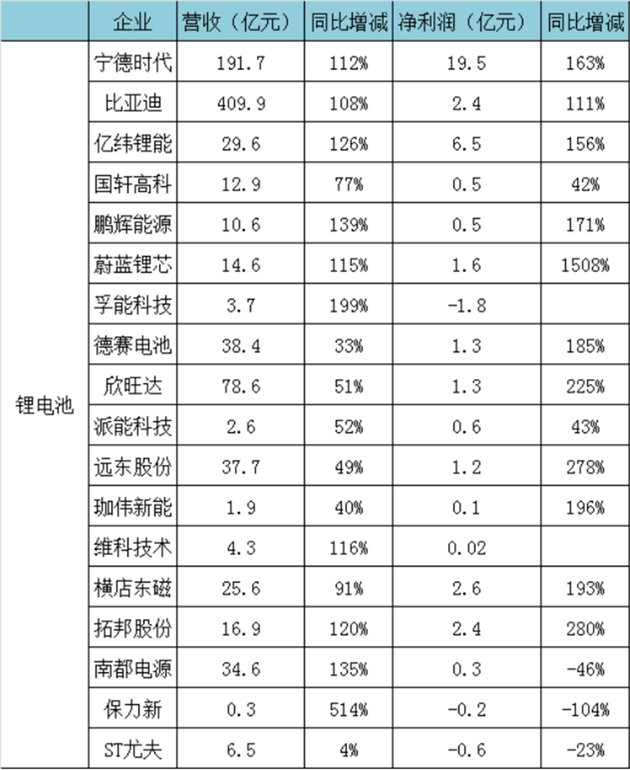 受電動(dòng)汽車銷量增長帶動(dòng),包括寧德時(shí)代、億緯鋰能、國軒高科、鵬輝能源、中航鋰電等電池企業(yè)在一季度都處于訂單飽滿,滿產(chǎn)排產(chǎn)狀態(tài),實(shí)現(xiàn)動(dòng)力電池裝機(jī)電量大幅增長,進(jìn)而實(shí)現(xiàn)營收凈利同雙增長。