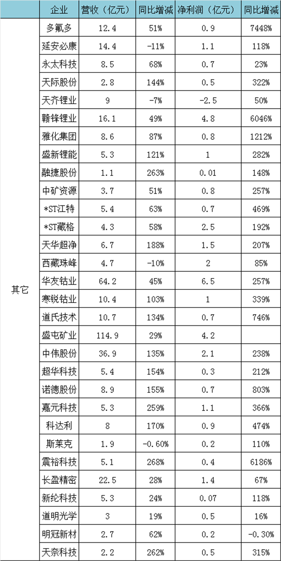 其中,贛鋒鋰業(yè)凈利潤同比增長超60倍,天齊鋰業(yè)仍處于虧損狀態(tài)但虧損收窄,寒銳鈷業(yè)凈利潤同比增長超3倍等。