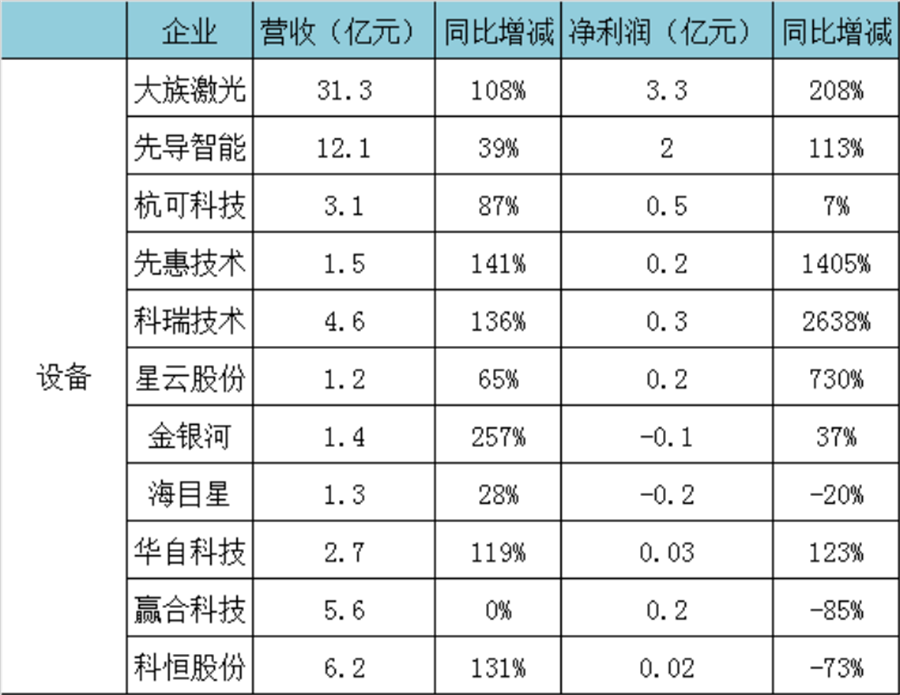 從業(yè)績上來看,頭部設(shè)備企業(yè)受益明顯。其中先導(dǎo)智能一季度凈利潤同比增長113%,一季度新簽訂單38.49億元(不含稅)。