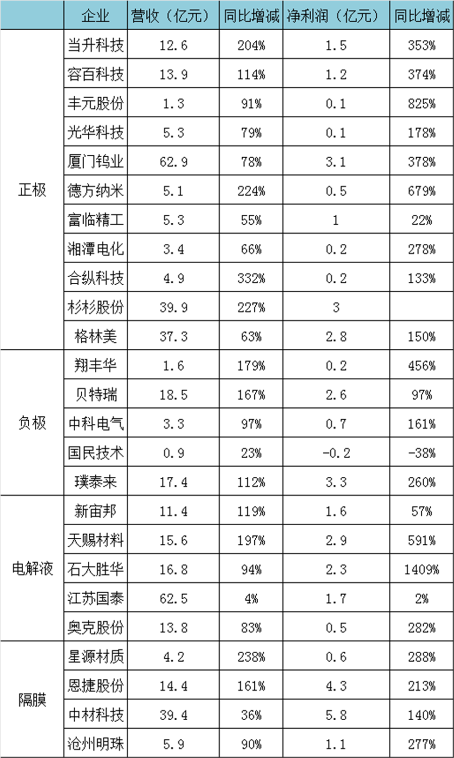 除了正極材料之外,負(fù)極、隔膜和電解液等材料也因市場需求增長帶動(dòng),助推上述領(lǐng)域的頭部企業(yè)營收凈利大幅增長。