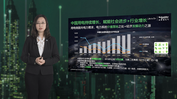 趙天意指出,“從歷史數(shù)據(jù)可以看出,我國GDP與全國用電量的增長曲線基本呈現(xiàn)正相關(guān)。在新基建和電能替代的雙重帶動下,我們判斷國內(nèi)的用電量將會持續(xù)增加。但當(dāng)前我國平均的能源使用效率仍然偏低,這顯然與可持續(xù)發(fā)展所要求的低排放、高能效不符,因此整個用電側(cè)存在著極大的能效改善空間。”