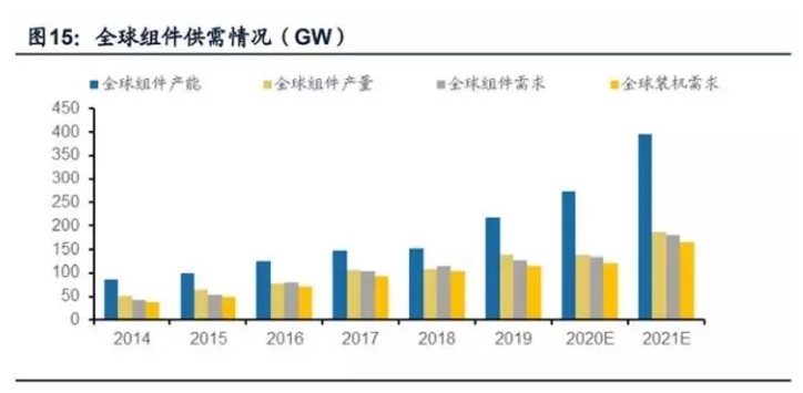2019年,在補(bǔ)貼總量限制的情況下,國內(nèi)新增光伏裝機(jī)首次下滑到30.1GW,無處可去的剩余產(chǎn)能只能選擇海外市場(chǎng)。受益于中國光伏產(chǎn)能過剩帶來的低價(jià)甜頭,這一年海外全年新增光伏裝機(jī)115GW,比2018年增加了近20GW,彌補(bǔ)了中國市場(chǎng)的部分損失。