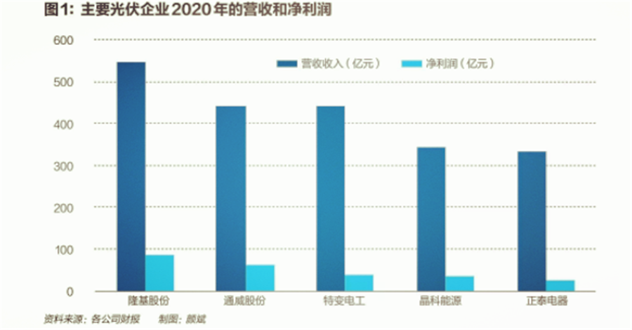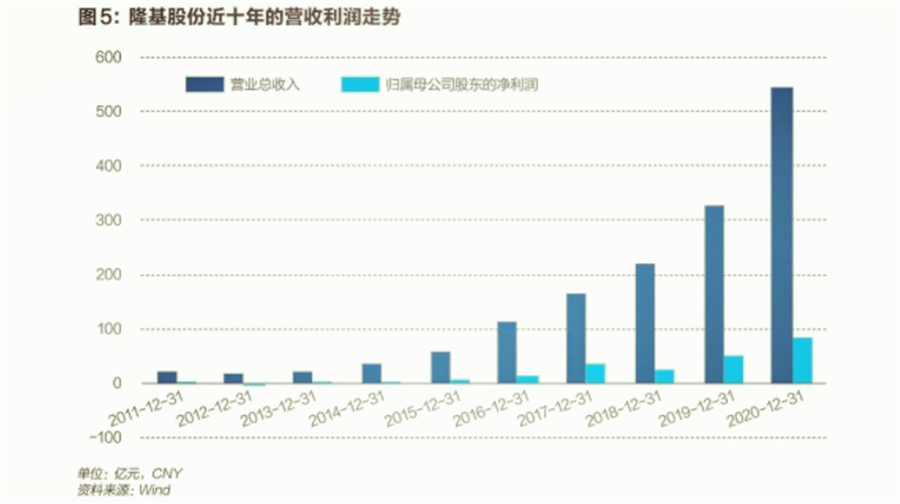 2020 年,隆基股份在光伏硅片市場(chǎng)的份額連續(xù)第三次占據(jù)榜首,在組件市場(chǎng)的份額首次獲得全球第一。同時(shí),隆基首次成為了光伏行業(yè)營(yíng)收、凈利潤(rùn)雙料冠軍,分別為545.8億元和85.5億元。