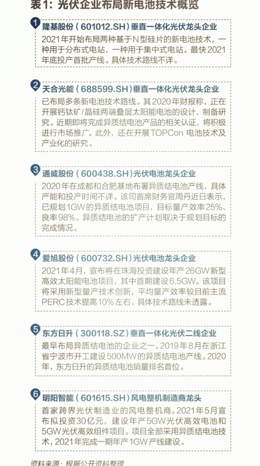 哪種新電池技術(shù)能夠獲勝,目前沒(méi)有答案。最先加入電池新技術(shù)競(jìng)賽的是二三線(xiàn)光伏企業(yè);去年起,通威股份(600438.SH)等頭部企業(yè)也開(kāi)始積極研發(fā)新電池,隆基則直到今年才表示將布局新技術(shù)的電池產(chǎn)線(xiàn)。