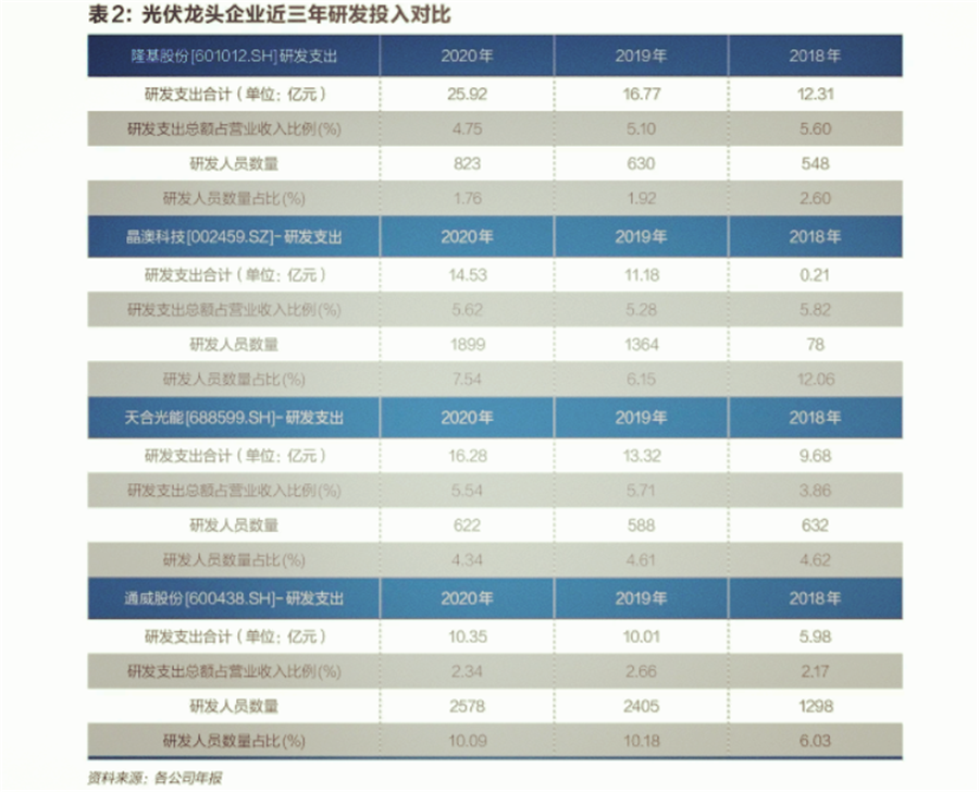 2020年,隆基的研發(fā)人員數(shù)量為823人,研發(fā)投入為25.92億元,占營(yíng)收的比例為4.75%。同期,另一光伏龍頭企業(yè)天合光能(688599.SH)研發(fā)人員數(shù)量為622人,研發(fā)投入為16.28億元,占營(yíng)收總額的比例為5.54%。