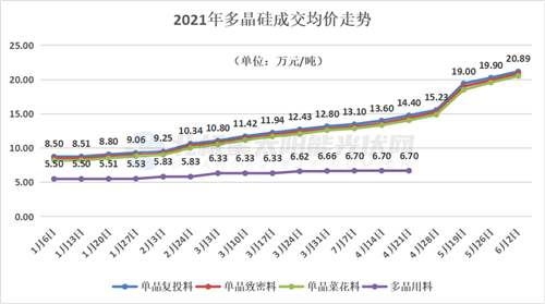 自2021年以來,多晶硅價價格便開啟了直線上漲模式。據(jù)統(tǒng)計,自年初以來單晶復(fù)投料漲幅達(dá)到了141.89%,單晶致密料漲幅達(dá)到了145.769%,單晶菜花料漲幅達(dá)到了150.24%。并且,硅料價格長單、散單價格還在延續(xù)上漲勢頭。據(jù)悉,6月份有三家萬噸級硅料企業(yè)被迫計劃檢修,預(yù)計6月份國內(nèi)多晶硅產(chǎn)量將進(jìn)一步減少,降幅在3%左右。
