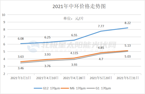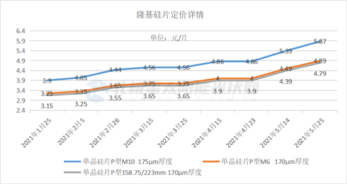 值得關(guān)注的是,硅料價格上漲壓力正在不斷向下傳導(dǎo)。5月,兩家硅片龍頭企業(yè)一個月內(nèi)相繼2次宣布上調(diào)了硅片價格。截止至5月末,隆基M10硅片最新報價達(dá)5.87元,M6硅片價為4.89元,G1硅片價為4.39元,較4月23日的報價漲幅分別為20.78%、22.25%、22.82%。中環(huán)G12( 170μm)硅片最新價格為8.22元、M6( 170μm)硅片價為5.13元,G1( 170μm)硅片價為5.03元,分別較4月28日報價上漲25.5%、24.6%、27.99%。