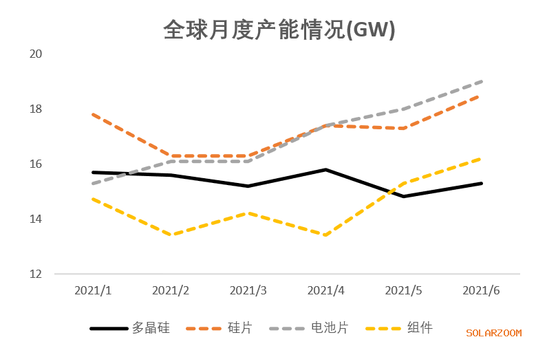 2021年4月,受產(chǎn)業(yè)鏈價(jià)格影響,導(dǎo)致整體市場(chǎng)需求略有下降,中國(guó)大陸市場(chǎng)的太陽(yáng)能電池片產(chǎn)量較上月略有下降