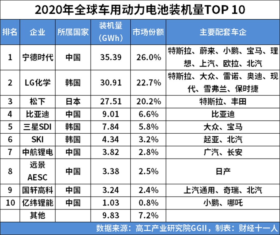 表1 :2020年全球車用動力電池裝機(jī)量TOP10