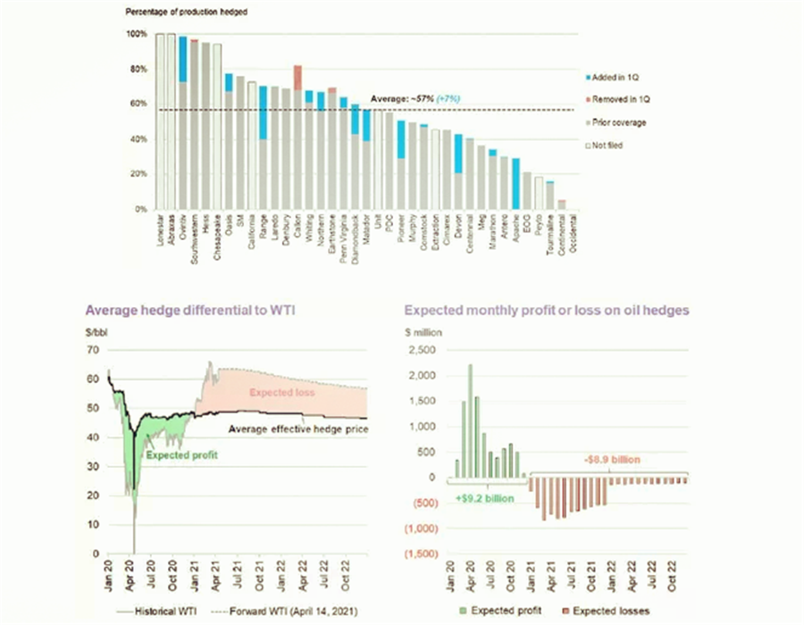 2020年,50家頁巖油企業(yè)的統(tǒng)計數(shù)據(jù)來看,其套保的結(jié)算價比WTI均價高出9美元/桶,總利潤估計為85億美元。而今年初以來,大部分的頁巖油企業(yè)的套保點位都在45美元/桶左右,對沖產(chǎn)量平均為57%;1季度WTI均價就已高出平均套保點位約11美元,造成了近17億美元的損失。