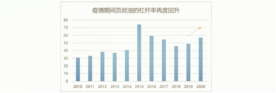 頁巖油行業(yè)的總體杠桿率一直比較高,2015年最高達到過74.3%。2020年受疫情影響,過高的負債使得行業(yè)平均杠桿率由19年的48.8%回升至57%。
