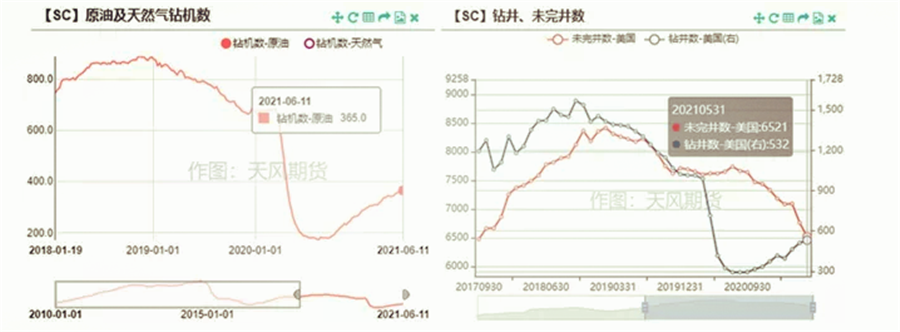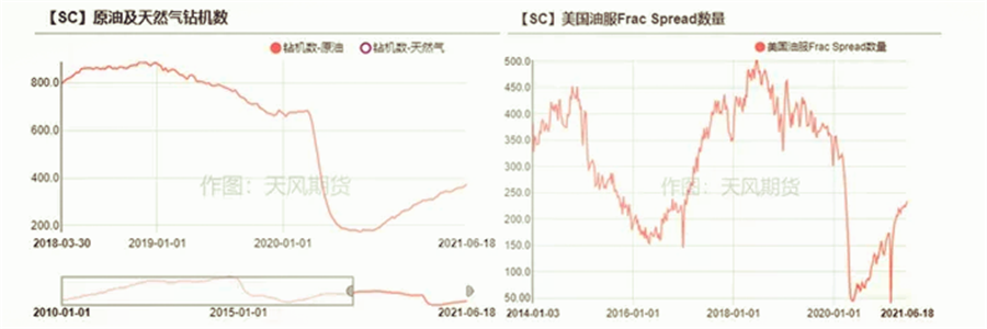 而到了今年上半年,歐洲的第三輪疫情、以及印度的失控也再次后置需求回歸的時間,但與去年不同的是,疫苗的接種率在不斷加快。截至6月中旬,美國單劑接種率已經(jīng)超過50%,歐洲的單劑接種率已經(jīng)接近40%,其中Eur-5的接種率也到了五成左右。在需求前景較為明朗的情況下,頁巖油商增產(chǎn)的意愿或有所提高。