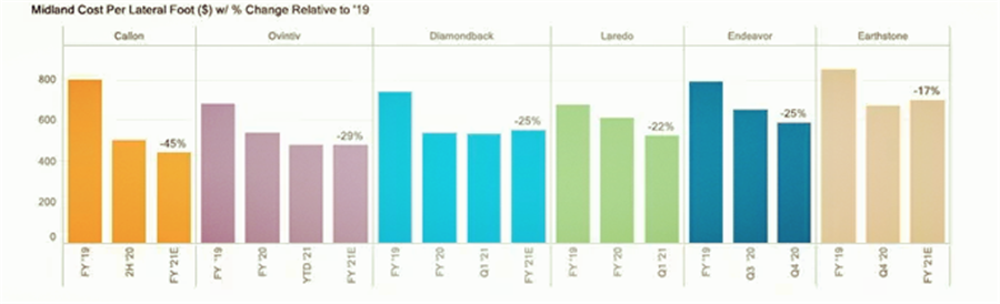 而從單位長度的挖掘成本來看,以Midland為例,其每英尺的橫向挖掘成本一直在下降,21年的預(yù)測值較19年的成本平均降幅在25%。