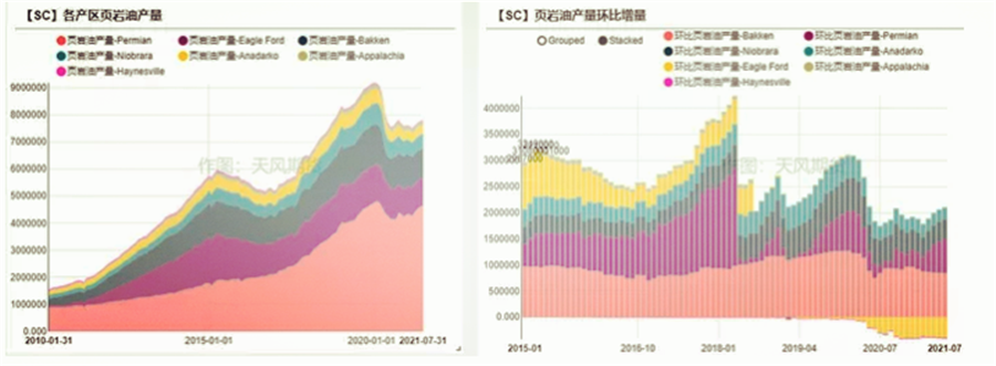 通過不斷回升的鉆機數(shù)和Frac Spread數(shù)量,可以看到頁巖油仍然在以一個均衡的速度慢慢恢復(fù),但由于舊油井的高衰退率,當前的產(chǎn)量并未出現(xiàn)較大幅度的增長。