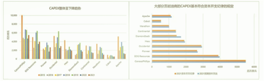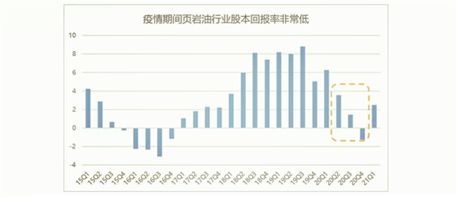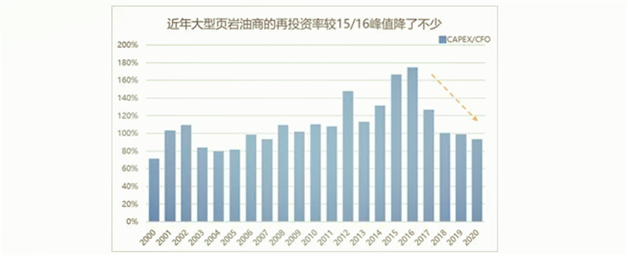 這些其實都可以說明,后疫情時代,頁巖油行業(yè)的經(jīng)營行為發(fā)生了改變,對疫情的不確定使得企業(yè)對于增產(chǎn)行為更加謹慎;巨大的債務(wù)壓力下,頁巖油企業(yè)需要將營收優(yōu)先用于償還債務(wù)以及回報股東,因此CAPEX的投入會減少;同時在政策導(dǎo)向的指引下,長周期來看資本投資偏好也會發(fā)生改變。
