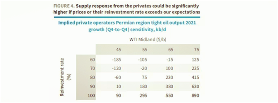 而今年下半年的再投資率的增量將主要來自于私營頁巖油商。由于大型頁巖油商需要衡量的因素更多,比如其他業(yè)務(wù)的拓展、對股東的責任以及碳排放的壓力等,近年來其再投資率(CAPEX/CFO)下降了不少,此前15/16年峰值曾接近過180%,而到2020年,再投資率已經(jīng)降至90%左右。而未上市的私營頁巖油企業(yè)更容易受到高價的誘惑,增產(chǎn)的限制也相對更少。