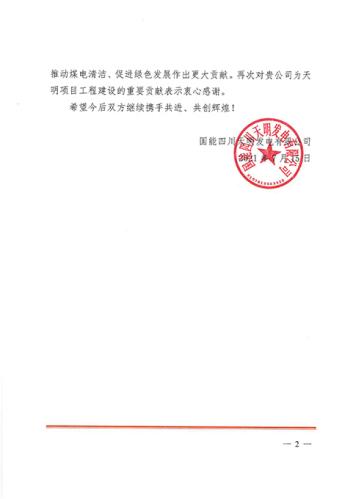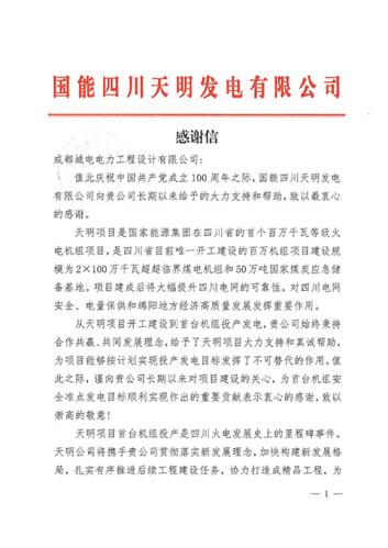 7月15日,四川科銳得實業(yè)集團有限公司下屬成都城電電力工程設(shè)計有限公司收到來自國能四川天明發(fā)電有限公司的感謝信,感謝城電公司長期以來給予天明公司的大力支持和幫助。