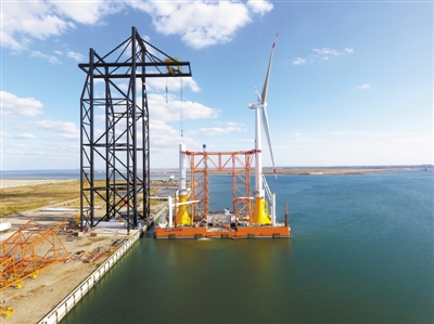 “傳統(tǒng)的海上風機安裝建造,一般是由運輸船舶將零部件運輸?shù)胶I辖ㄔ斓奈恢?,分部施工安裝,完成整機調(diào)試。而這樣一套安裝流程,至少需要5天才能完成,有時候遇到強臺風,甚至時間更長。”王海軍介紹,“海上施工窗口期十分寶貴,為了提高海上風機安裝效率,需要把組裝好的海上風機直接運送到位。”