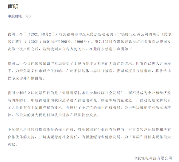 8月2日,中航鋰電官微發(fā)布聲明,證實已收到福州中院送達的關于寧德時代起訴公司的兩份《民事起訴狀》,同時表示已于當日向國家知識產權局提交了上述兩件涉訴專利的無效宣告請求。