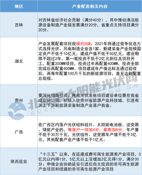 如吉林省風光項目分配實施細則(暫行)中競爭性配置細則要求,對吉林省經(jīng)濟社會發(fā)展貢獻滿分40分,占比高達40%。廣西則將產(chǎn)業(yè)配套設(shè)定為加分項,規(guī)定在廣西落戶硅料、硅片、電池、光伏逆變器及儲能產(chǎn)業(yè)的,每落戶一項得4分,最高可得8分。同時要求,年產(chǎn)量不低于30萬千瓦,組件、逆變器產(chǎn)值不低于3億元,其余產(chǎn)業(yè)產(chǎn)值不低于1億元。并要求未開工建設(shè)的一年半內(nèi)建成投產(chǎn)。