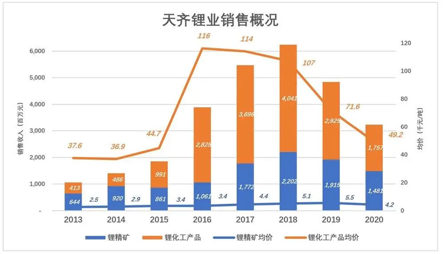 鋰化工產(chǎn)品銷(xiāo)售收入從2013年的4.1億增至2020年的17.6億,占營(yíng)收的49.2%。但峰值出現(xiàn)在2016年,為11.6萬(wàn)元/噸;2019年單價(jià)跌至7.2萬(wàn)元/噸;2020年鋰化工產(chǎn)品單價(jià)跌至4.9萬(wàn)元,鋰輝石單價(jià)也跌至4200元/噸。