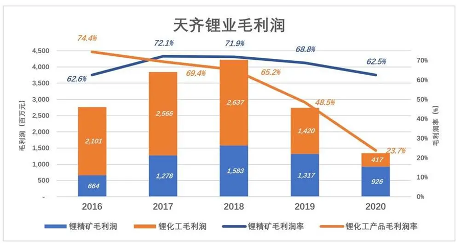 2019年、2020年受新能源車(chē)補(bǔ)貼退坡及疫情等因素影響,兩項(xiàng)業(yè)務(wù)毛利潤(rùn)都大幅下跌,但“賣(mài)礦石”業(yè)務(wù)明顯抗跌。到2020年,鋰精礦業(yè)務(wù)毛利潤(rùn)9.3億,是鋰化工業(yè)務(wù)的222%,毛利潤(rùn)率仍高達(dá)62.5%。