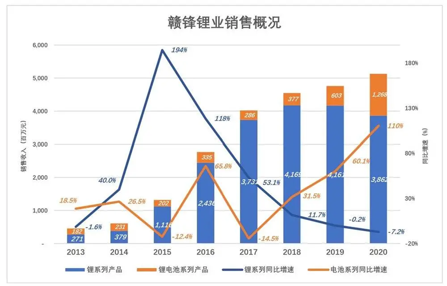 2013年鋰精礦石銷(xiāo)售收入6.4億、占營(yíng)收的60.2%,2020年鋰精礦石銷(xiāo)售收入增到14.8億、占營(yíng)收的比例降至45.7%;