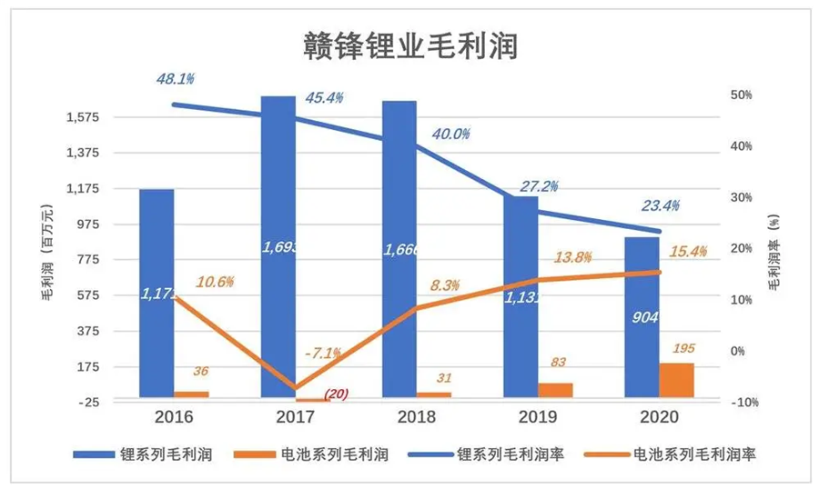 贛鋒鋰電池業(yè)務(wù)初見(jiàn)成效,2017年毛利潤(rùn)率負(fù)7.1%,2020年爬升至15.4%(寧德時(shí)代動(dòng)力電池毛利潤(rùn)率為26.6%),金額不足2億。研發(fā)、管理、市場(chǎng)費(fèi)用一扣,電池業(yè)務(wù)肯定虧損。而天齊賣(mài)賣(mài)鋰礦石,2020年毛利潤(rùn)達(dá)到9.3億。整體算下來(lái),2020年贛鋒毛利潤(rùn)僅為天齊的88%(2019年為46%)。