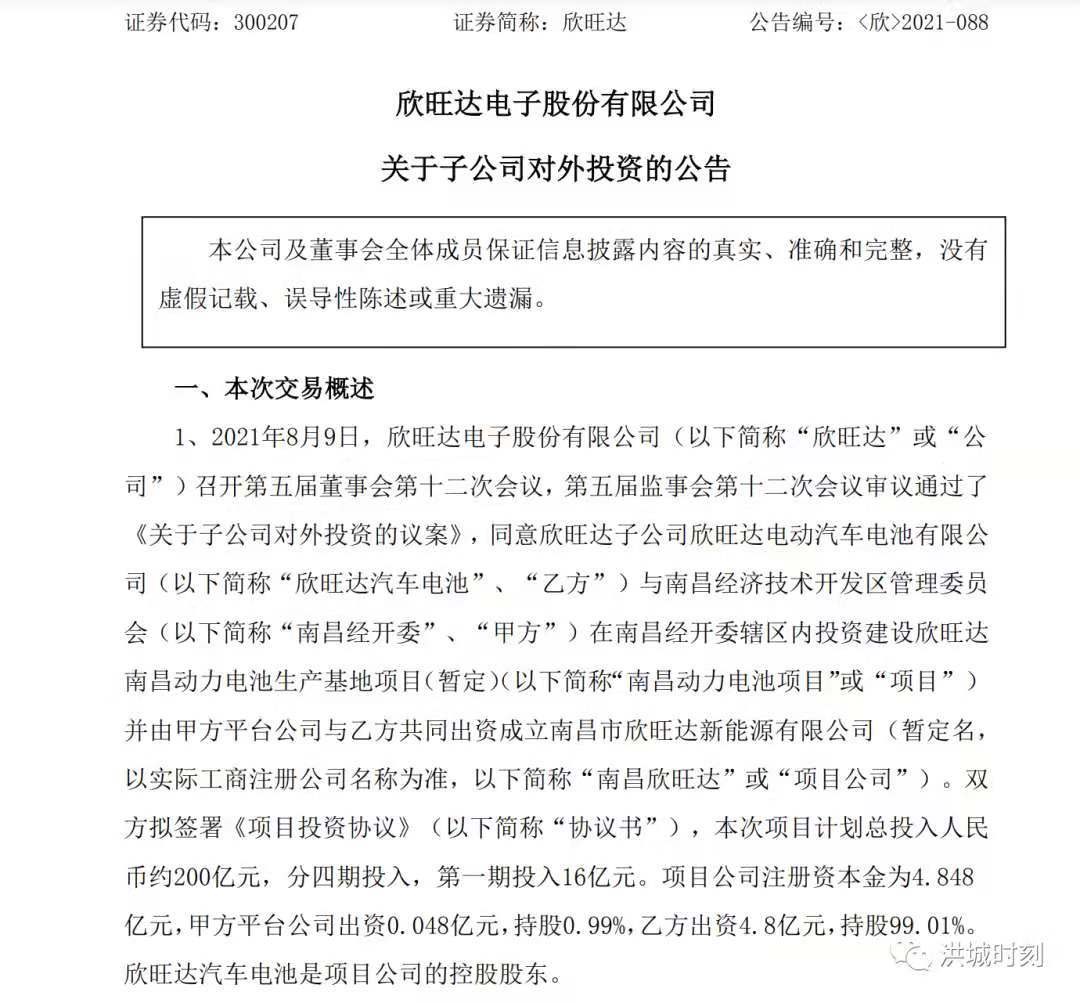 2021年8月9日,欣旺達(dá)電子股份有限公司(以下簡稱“欣旺達(dá)”或“公司”)召開第五屆董事會(huì)第十二次會(huì)議,第五屆監(jiān)事會(huì)第十二次會(huì)議審議通過了《關(guān)于子公司對(duì)外投資的議案》,同意欣旺達(dá)子公司欣旺達(dá)電動(dòng)汽車電池有限公司(以下簡稱“欣旺達(dá)汽車電池”、“乙方”)與南昌經(jīng)濟(jì)技術(shù)開發(fā)區(qū)管理委員會(huì)(以下簡稱“南昌經(jīng)開委”、“甲方”)在南昌經(jīng)開委轄區(qū)內(nèi)投資建設(shè)欣旺達(dá)南昌動(dòng)力電池生產(chǎn)基地項(xiàng)目(暫定)(以下簡稱“南昌動(dòng)力電池項(xiàng)目”或“項(xiàng)目”)并由甲方平臺(tái)公司與乙方共同出資成立南昌市欣旺達(dá)新能源有限公司(暫定名,以實(shí)際工商注冊(cè)公司名稱為準(zhǔn),以下簡稱“南昌欣旺達(dá)”或“項(xiàng)目公司”)。