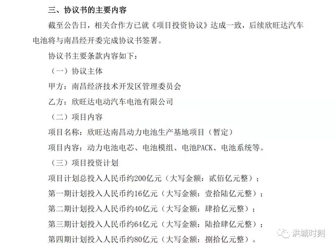 截至公告日,相關(guān)合作方已就《項(xiàng)目投資協(xié)議》達(dá)成一致,后續(xù)欣旺達(dá)汽車電池將與南昌經(jīng)開委完成協(xié)議書簽署。