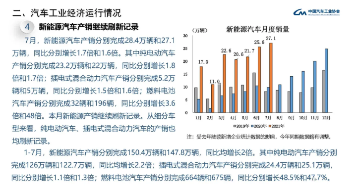 根據(jù)公布的數(shù)據(jù)顯示,7月,新能源汽車產(chǎn)銷分別完成28.4萬輛和27.1萬輛,同比分別增長1.7倍和1.6倍,其中純電動汽車產(chǎn)銷分別完成23.2萬輛和22萬輛,同比分別增長1.8倍和1.7倍;插電式混合動力汽車產(chǎn)銷分別完成5.2萬輛和5萬輛,同比分別增長1.5和1.6倍;燃料電池汽車產(chǎn)銷分別完成32輛和196輛,同比分別增長1.5倍和1.6倍。本月新能源產(chǎn)銷繼續(xù)刷新記錄,從細(xì)分車型來看,純電動汽車、插電式混合動力的產(chǎn)銷也均刷新記錄。