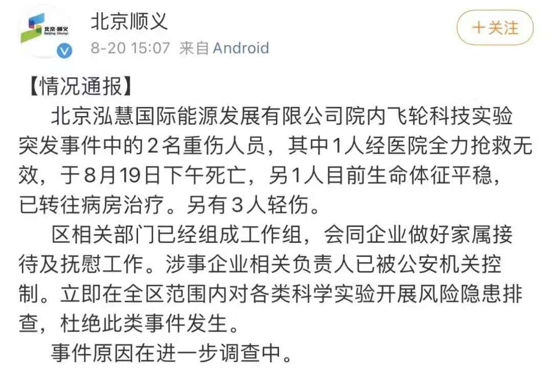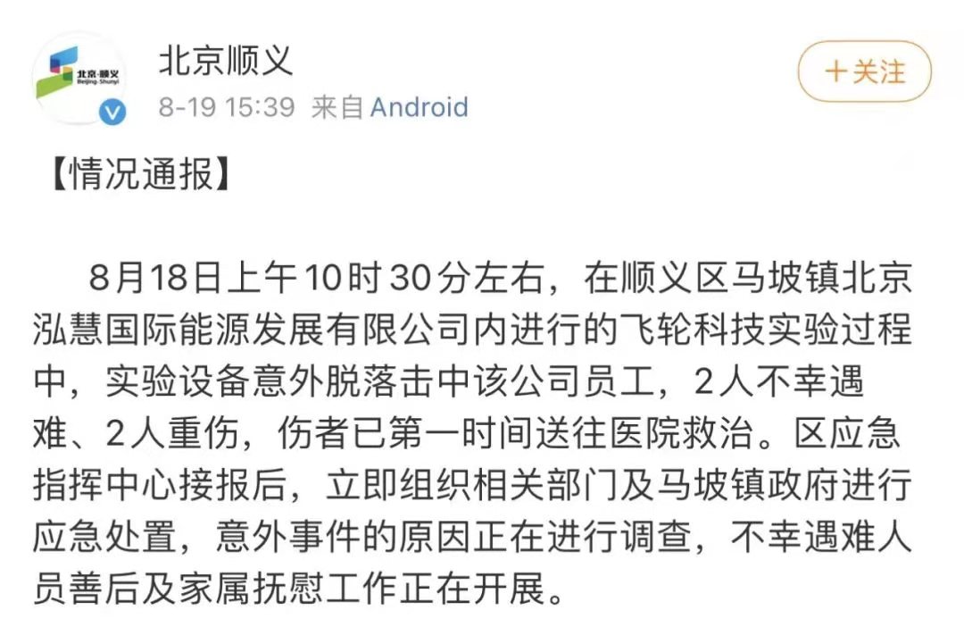 8月18日上午10時(shí)30分左右,在北京市順義區(qū)馬坡鎮(zhèn)北京泓慧國(guó)際能源發(fā)展有限公司內(nèi)進(jìn)行的飛輪科技實(shí)驗(yàn)過(guò)程中,實(shí)驗(yàn)設(shè)備意外脫落擊中該公司員工,2人不幸遇難、2人重傷,傷者已第一時(shí)間送往醫(yī)院救治。區(qū)應(yīng)急指揮中心接報(bào)后,立即組織相關(guān)部門(mén)及馬坡鎮(zhèn)政府進(jìn)行應(yīng)急處置,意外事件的原因正在進(jìn)行調(diào)查,不幸遇難人員善后及家屬撫慰工作正在開(kāi)展。