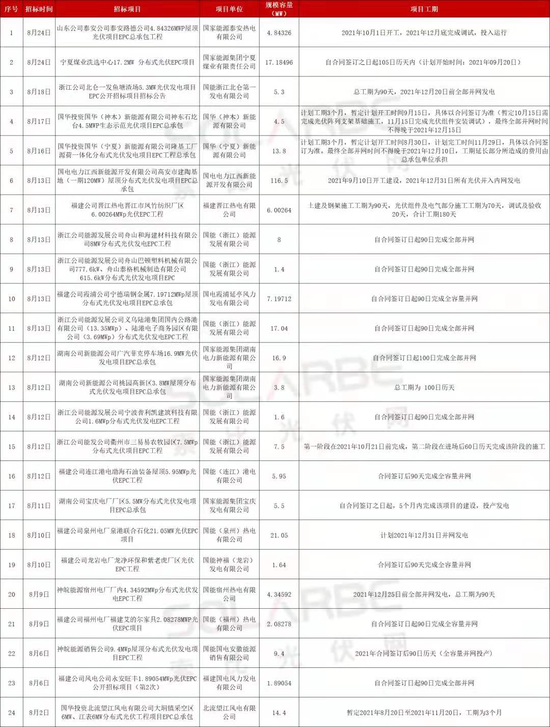 據(jù)索比光伏網(wǎng)統(tǒng)計(jì),國(guó)家能源集團(tuán)在8月份發(fā)布了24個(gè)分布式光伏項(xiàng)目EPC招標(biāo),裝機(jī)容量合計(jì)300MW,大多要求年底前并網(wǎng)。