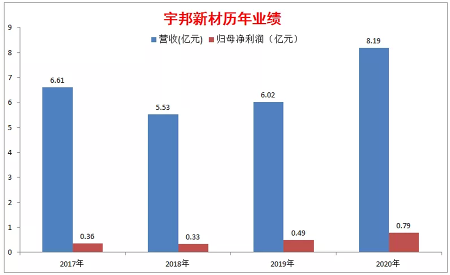 而在2020年我國(guó)光伏裝機(jī)量大幅增長(zhǎng)的背景下,宇邦新材成功登上了新科組件出貨量冠軍隆基股份的快車,實(shí)現(xiàn)了營(yíng)收和歸母凈利潤(rùn)的大幅增長(zhǎng)。其中,營(yíng)收增長(zhǎng)了36%,歸母凈利潤(rùn)增長(zhǎng)了61.2%。