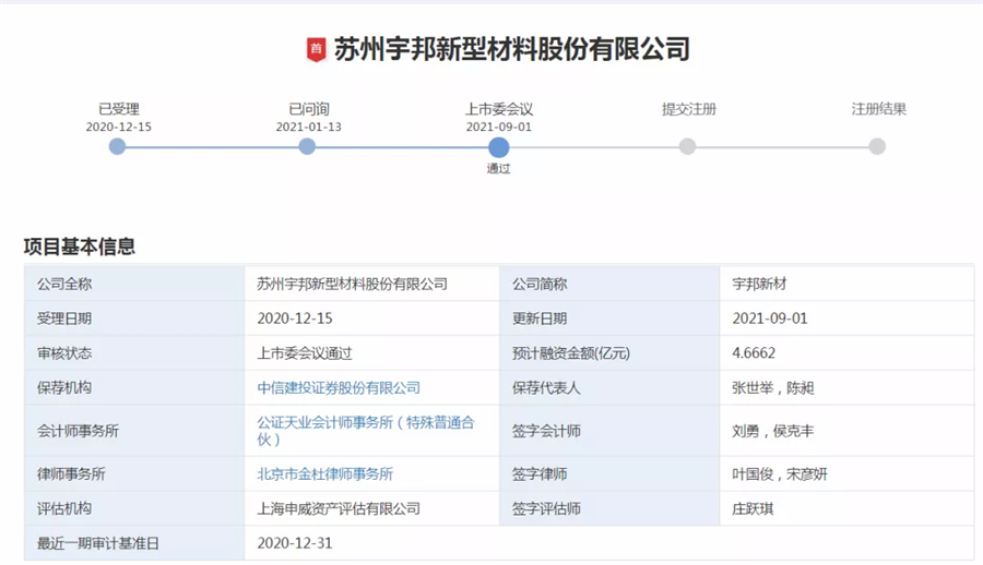 9月1日,據(jù)深圳證券交易所創(chuàng)業(yè)板發(fā)行上市審核信息公開網(wǎng)站顯示,蘇州宇邦新型材料股份有限公司(以下簡(jiǎn)稱“宇邦新材”)已通過(guò)上市委會(huì)議,將于深交所創(chuàng)業(yè)板上市。
