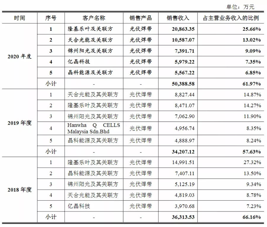 根據(jù)宇邦新材的招股說(shuō)明書顯示,2019年,隆基股份是宇邦新材的第二大客戶,銷售收入為8471萬(wàn)元,占比還稍低于天合光能。但在2020年,隆基股份不僅成為了宇邦新材第一大客戶,同時(shí)銷售收入也提高至2.086億元,占比高達(dá)25.66%。是其營(yíng)收增長(zhǎng)的重要支撐。