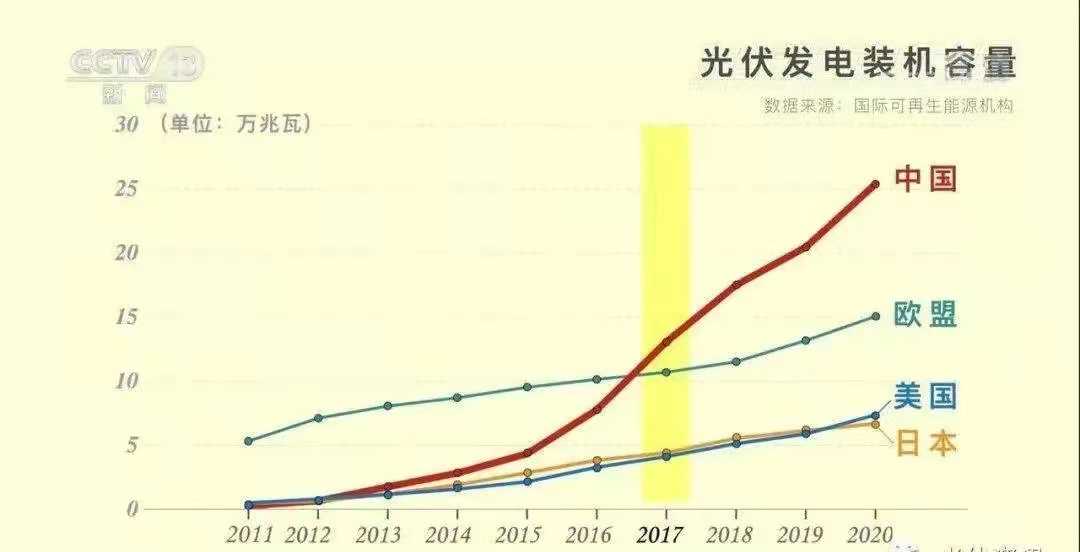 2011年,中國的裝機容量僅為日本、美國的六成,為歐盟的6%。從2013年起,國家加大節(jié)能減排力度,光伏產(chǎn)業(yè)快速發(fā)展。到2017年,中國的裝機容量就超過了整個歐盟的總和。