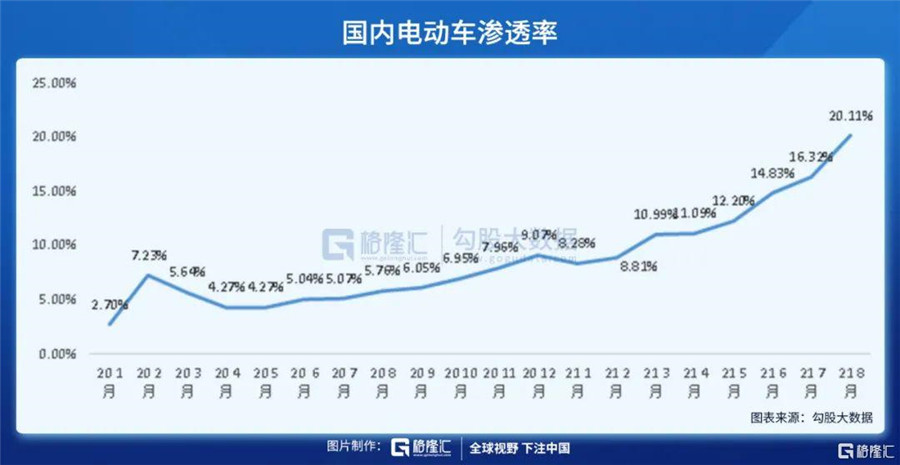 說完銷量,來看看最關(guān)心的滲透率。新能源汽車1-8月滲透率12.8%。8月滲透率(批發(fā)量數(shù)據(jù))達(dá)到20.1%,7月滲透率為16.32%,滲透率環(huán)比大幅上升,同時(shí)這也是第一次新能源汽車國內(nèi)滲透率破20%。滲透率在經(jīng)過了一年的緩慢爬坡之后,開始進(jìn)入加速階段。市場上更有券商大膽預(yù)測(cè),實(shí)現(xiàn)25%的滲透率或許不是在2025年,很有可能會(huì)在2022年提前到來。
