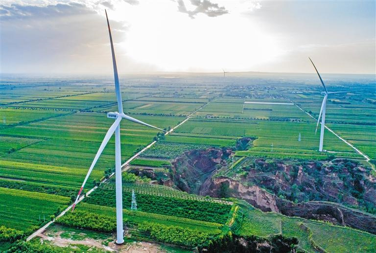 8月23日,航拍位于合陽縣黑池鎮(zhèn)峪北村的中國(guó)電建集團(tuán)新能源電力有限公司幸福風(fēng)電場(chǎng)風(fēng)電機(jī)組。該機(jī)組于2020年底實(shí)現(xiàn)并網(wǎng)發(fā)電。截至8月22日,幸福風(fēng)電場(chǎng)累計(jì)發(fā)電409萬千瓦時(shí)。本報(bào)記者 袁景智攝