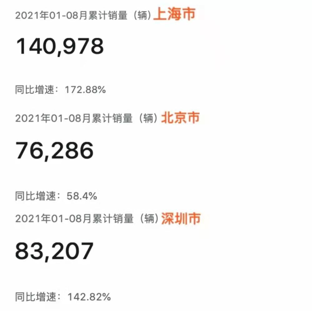 從今年全國前8個(gè)月的新能源車銷量數(shù)據(jù)來看,上海市一騎絕塵,達(dá)到140978輛,同比增漲172.88%,而北京和深圳前8個(gè)月的新能源銷量總和才為159493輛,上海市新能源車型的銷量已經(jīng)接近北京和深圳總和。