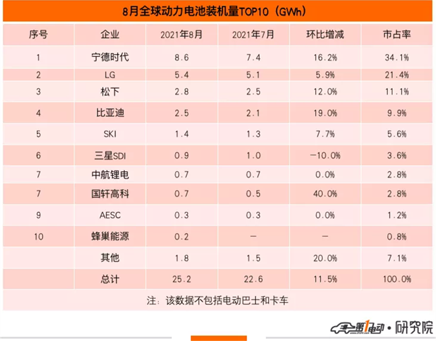 8月,寧德時代繼續(xù)高歌猛進,穩(wěn)坐冠軍寶座,LG、松下分列季軍和亞軍。正在慢慢逼近松下的比亞迪和SKI分列前五;三星SDI、中航鋰電、國軒高科、遠景AESC、蜂巢能源分列前十。