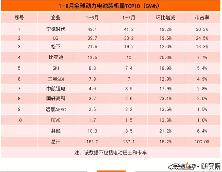 累計來看,1-8月全球動力電池裝機量為162GWh,環(huán)比增長18.2%。全球前十動力電池企業(yè)裝機量為151.7GWh,市占率達93.6%,市場集中度進一步提升,其中寧德時代、LG、松下、比亞迪、SKI穩(wěn)居前五。
