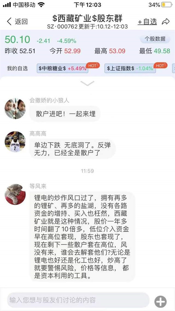在尺度的西藏礦業(yè)股東群,有投資者稱,鋰電的炒作風(fēng)口過(guò)了,擁有再多的鋰礦、再多的鹽湖,沒(méi)有各路資金的增持、買入也枉然,西藏礦業(yè)就是這種情況,股價(jià)一年多時(shí)間翻了10倍多,低位介入資金早在高位套現(xiàn),股東也套現(xiàn)了,現(xiàn)在剩下一些散戶套在高位,風(fēng)沒(méi)有來(lái),誰(shuí)會(huì)去解套他們?無(wú)論是鋰電也好還是化工也好,炒高了就要警惕風(fēng)險(xiǎn),賽道、價(jià)格等信息,容易成為資本利用的工具。