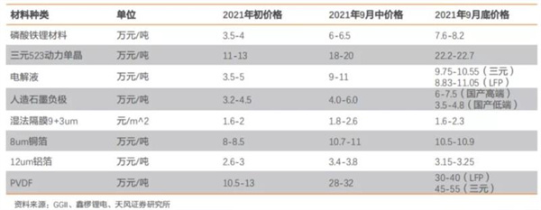 2021年以來,因下游景氣高漲,動(dòng)力電池原材料供不應(yīng)求,四大主材、鎳/鈷/鋰/銅/鋁、氫氧化鋰、碳酸鋰、六氟磷酸鋰、PVDF、VC等價(jià)格集中上揚(yáng),部分輔材較年初上漲數(shù)倍,甚至“一貨難求”。