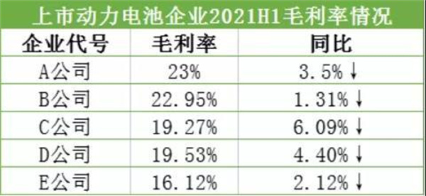 2021上半年頭部5家上市公司動(dòng)力電池業(yè)務(wù)毛利率均出現(xiàn)了不同程度的下滑,且整體毛利率處于23%及以下。