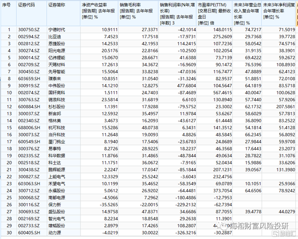 這個(gè)指數(shù)是市值越大,權(quán)重越高 ,其中寧德時(shí)代的權(quán)重 14.27%,比亞迪權(quán)重 10.57%,陽(yáng)光電源 權(quán)重 6.44%,根據(jù) 中證指數(shù)選出來(lái)的30個(gè)股,我拉了幾個(gè)財(cái)務(wù)數(shù)據(jù) 。前面幾個(gè)財(cái)務(wù)數(shù)據(jù)記錄的是過(guò)去 ,凈資產(chǎn)收益率越高的公司 資產(chǎn)質(zhì)量越好,毛利率高的企業(yè)代表行業(yè)的競(jìng)爭(zhēng)格局和定價(jià)權(quán)品牌力 ,未來(lái)3年?duì)I收和凈利潤(rùn)增長(zhǎng)取自于國(guó)內(nèi)分析師對(duì)它的業(yè)績(jī)預(yù)期。