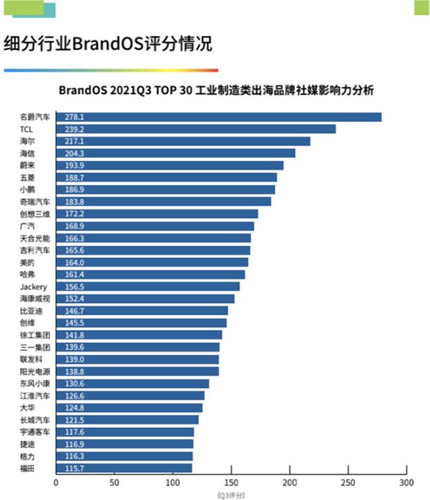 近日,上汽乘用車MG品牌以278.1分高居《BrandOSTOP100出海品牌社交影響力榜單》“工業(yè)制造類出海品牌社媒影響力分析榜”榜首。作為首份對中國大陸品牌在海外社交媒體平臺影響力評估的榜單,該榜單通過對3000家以上品牌的海量數(shù)據(jù)計算評分,為品牌的全球化進程提供具有全球參考意義的客觀指標。