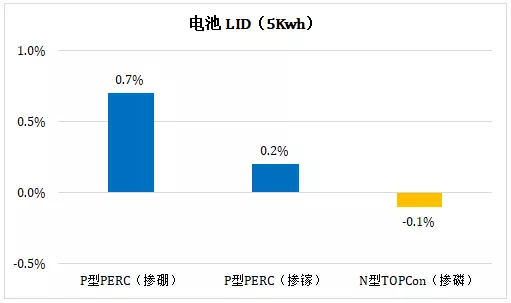 1973年H.Fischer等在P型摻硼CZ晶硅電池上發(fā)現(xiàn)了LID,1997年Jan Schmid等證實這是因為形成了硼氧復(fù)合中心,該機(jī)理得到了業(yè)界一致認(rèn)可。為了在P型晶硅上改善這一問題,工業(yè)屆采取了如下幾種方式:(1)降低氧含量,通過熱場及拉晶工藝降低硅片氧含量;(2)采用鎵替代硼作為P型摻雜劑;(3)LID恢復(fù)處理:2006年Alex Herguth等人發(fā)現(xiàn)在較高溫度的光照條件下或在施加正向電流的情況下,硼氧對會經(jīng)歷衰減—再生過程,這一過程能有效改善LID現(xiàn)象。而摻磷的N型晶硅因為硼含量極低,本質(zhì)上消除了硼氧對的影響,幾乎不會產(chǎn)生LID現(xiàn)象。晶科能源根據(jù)IEC 63202-1標(biāo)準(zhǔn)規(guī)定的LID測試內(nèi)容(1 sun,60±5 ℃,一般累計5 kWh,最大20kWh),對典型的晶硅電池LID(5kWh)衰減進(jìn)行了測試,結(jié)果如下圖所示: