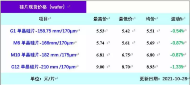 10月下旬,因光伏產(chǎn)業(yè)鏈價格持續(xù)上漲,終端電站建設(shè)需求低迷,硅片出現(xiàn)了小幅下滑的跡象。由于對年末搶裝的預(yù)期,硅片價格隨后企穩(wěn)。