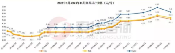 對標(biāo)11月的硅片價格,中環(huán)的G1硅片,每片下降0.52元,降幅9.1%;M6硅片下降0.72元,降幅12.48%;G12硅片下降0.55元,降幅6.04%。